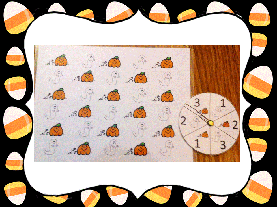 Player A takes 10 pumpkin erasers and places them on the pumpkin and Player B takes 10 ghost erasers and places them on the ghost. Each player, in turn, spins the spinner and does what it says. For example, if Player A spins “get 2”, Player A must take 2 ghost erasers and put them with their pumpkin erasers. If Player B spins “lose 3”, Player B gives 3 of the ghost erasers to Player A. The first player to end up with zero erasers wins.